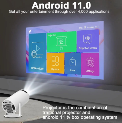 With this compact portable projector, you can turn any room into your own private cinema in no time. Simply place it down, adjust the angle, and enjoy a bright, high-quality image of up to 130 inches. Thanks to the built-in Android 11 system, you can stream your favorite apps instantly without extra devices. Whether you want to watch movies on the wall or relax while projecting onto the ceiling, this lightweight projector makes every viewing moment effortless.